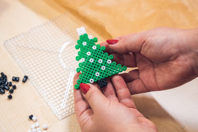 • Nejprve si vytvoříme ozdobu ze zažehlovacích korálků ve tvaru stromečku. Zažehlovací korálky skládáme na podložku.