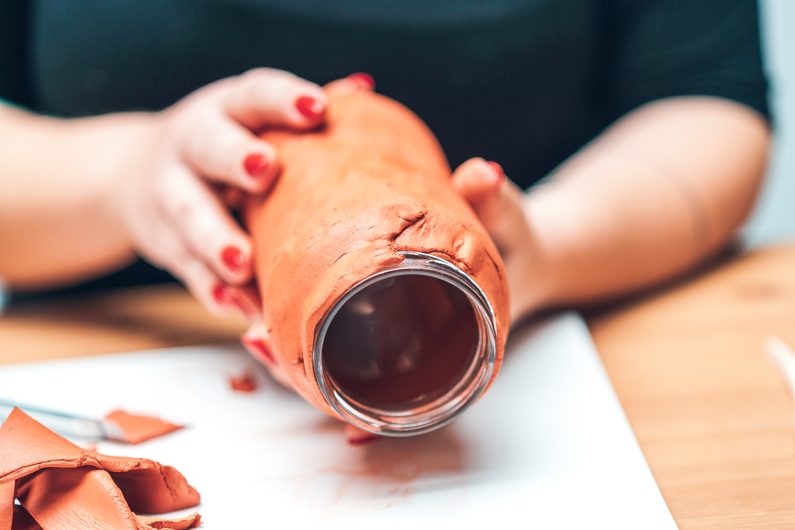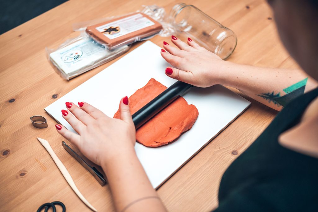 Ze samotvrdnoucí hmoty si vyválíme plát silný cca 3 mm. Položíme na něj sklenici a uřízneme hmotu, která odpovídá jejímu obvodu. Hmotu uzpůsobíme pomocí ulamovacího nože a seřízneme nadbytečné okraje.