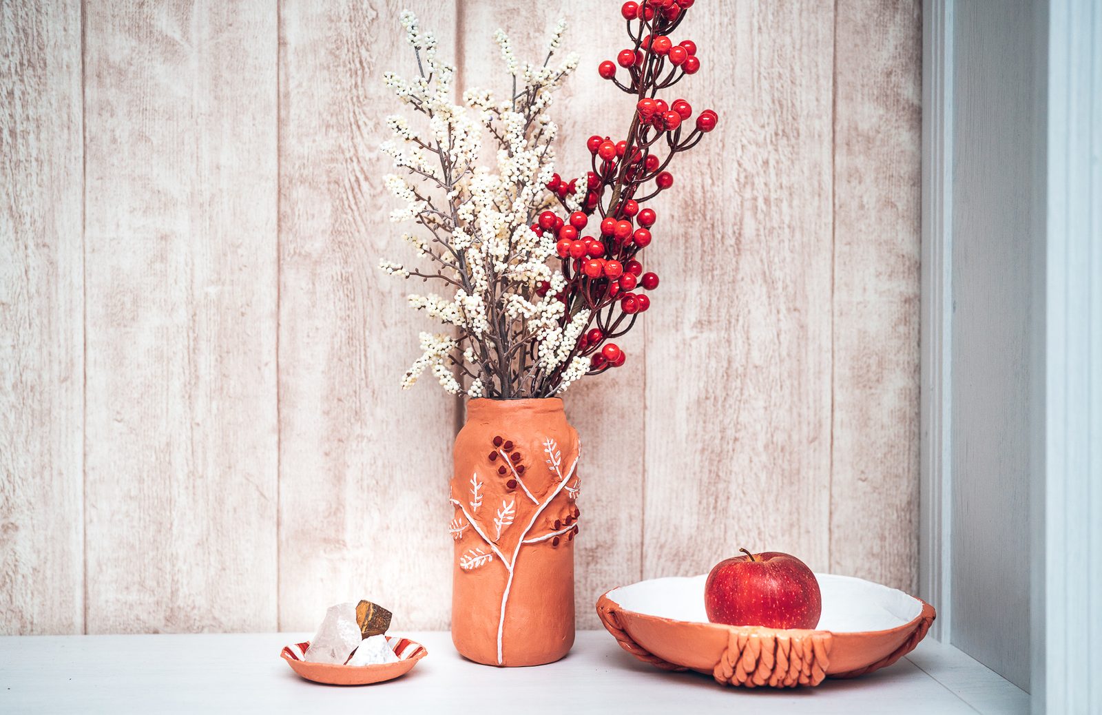 Hotový výrobek necháme minimálně 48 hodin volně vytvrdnout na vzduchu. Suchý výrobek můžeme dál dekorovat barvami. Pokud se chcete držet našeho vzoru, připravte si bílou a červenou akrylovou barvu. Jestli si nejste jistí při práci štětcem, můžete využít i akrylové fixy. Výrobek je určený pouze pro dekoraci a není voděodolný. Vázu používejte pouze na sušené květiny.