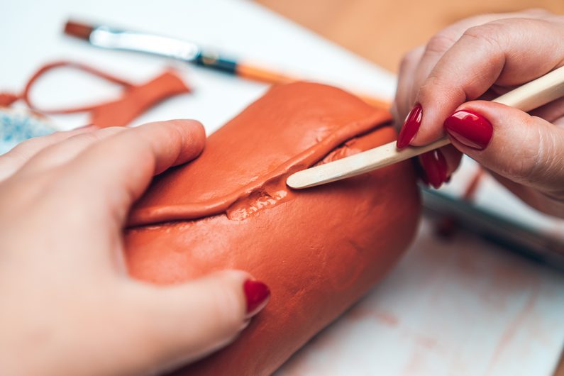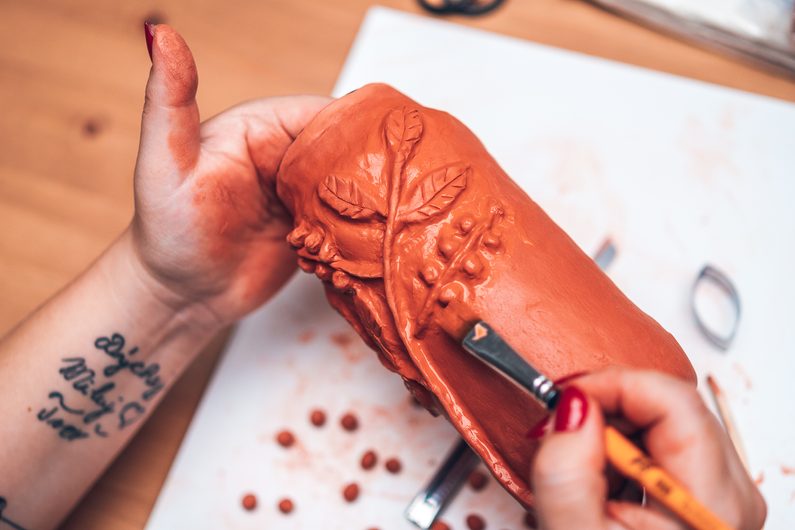 Motiv, kterým chceme vázu dekorovat, si nejprve do hmoty vyznačíme modelovacím nástrojem. Poté si vyválíme tenkého “hádka”, kterého do vzniklé rýhy přitlačíme. Modelovacím nástrojem a vlhkým štětcem hádka spojíme se základní hmotou.