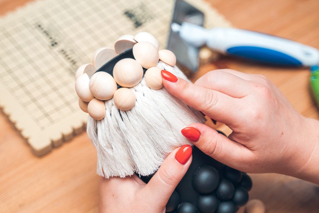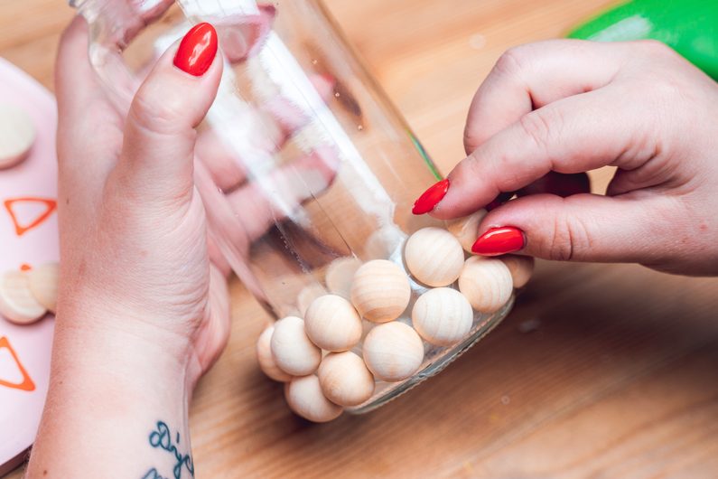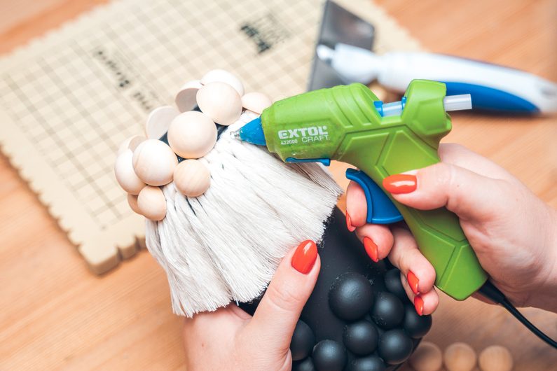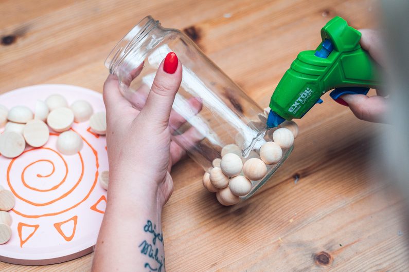 • Tavnou pistolí na odmaštěnou sklenici nalepíme dřevěné polokoule v libovolném rozvržení.