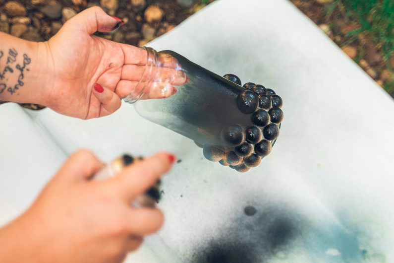 • V dobře větraném prostoru, ideálně venku, sklenici i s polokoulemi nastříkáme barvou ve spreji. Doporučujeme nanést několik vrstev, aby barva dobře pokryla polokoule ze všech stran.