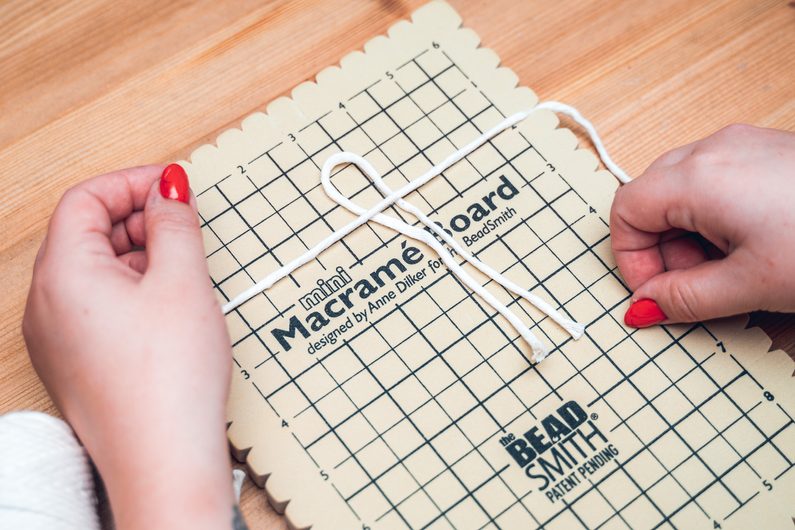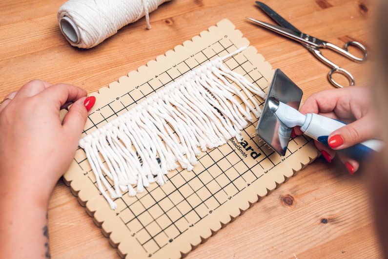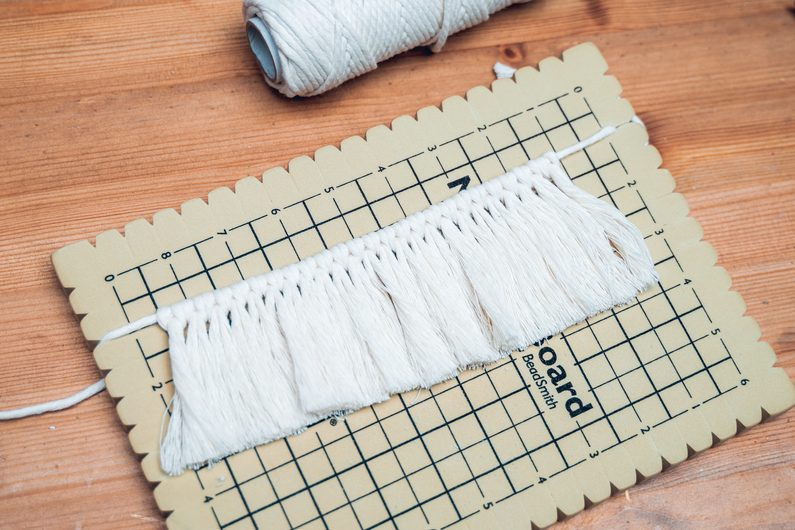 • Ustřihneme si jeden kousek příze, který bude v trojnásobku obvodu závitu sklenice. Ten bude naší vodící přízí. Připevníme ji na macramé podložku, nebo jinak přichytíme k podkladu. Dále si nastřiháme kratší kousky příze, které pomocí tzv. liščí smyčky na vodící přízi připevníme. Jejich množství zvolte takové, aby pokrylo celý závit sklenice.