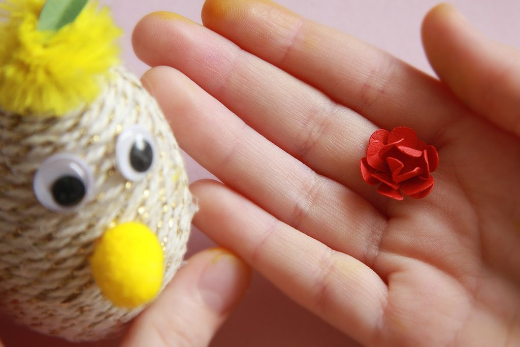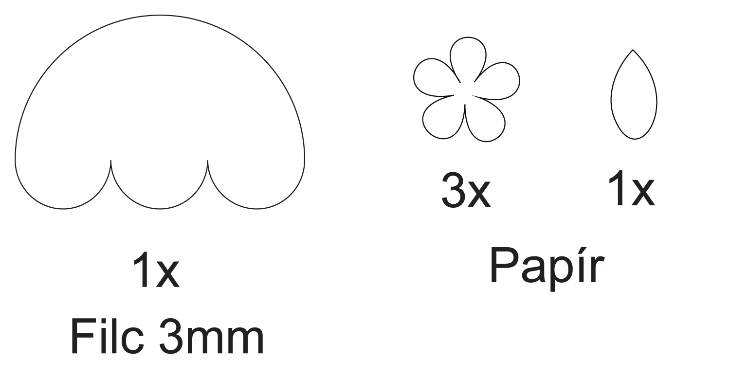 Vystřihneme si podle šablony lísteček ze zeleného papíru a kytičku z červeného papíru. Lísteček po vystřižení ohneme podélně napůl aby vypadal plastičtěji. Všechny tři vrstvy květu nalepíme na sebe, každou část květu vždy pootočíme tak aby lístečky byly v meziprostoru předchozího květu. Lepidlo dáváme do středu kytičky, stačí tečka lepidla. Kytičku po zaschnutí zlehka vytvarujeme prsty aby opět působila plasticky.