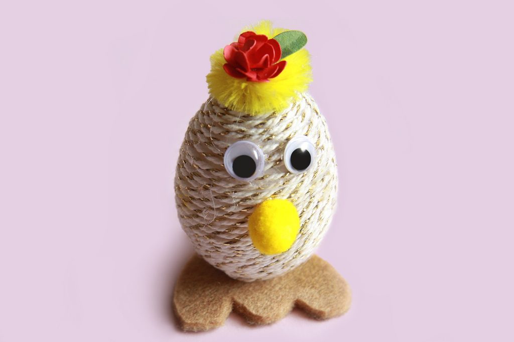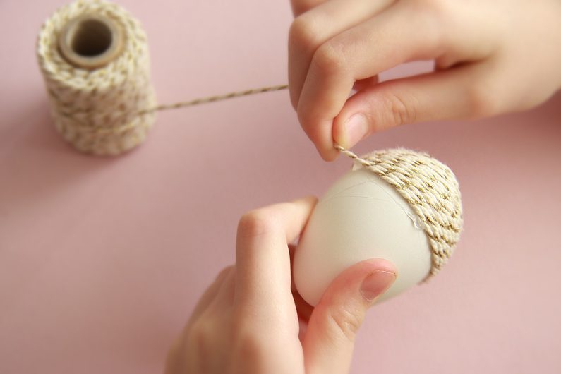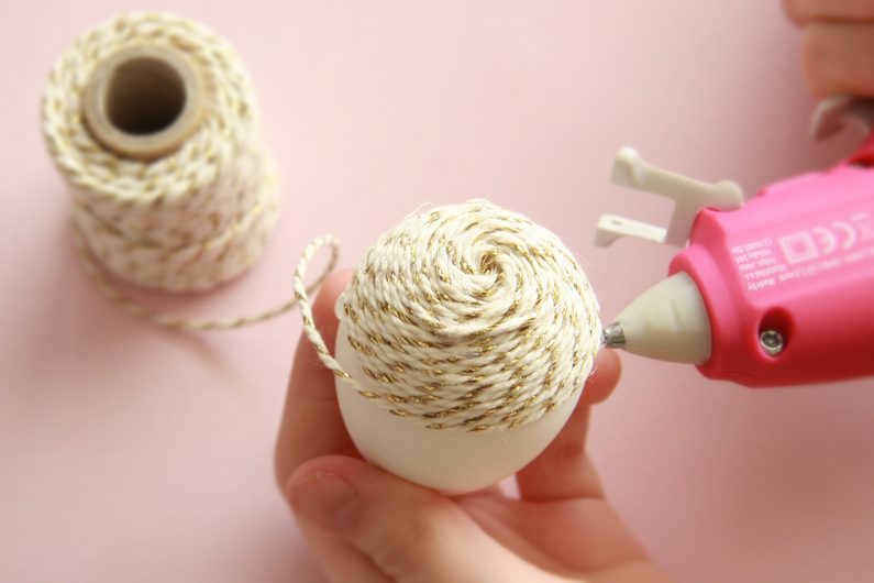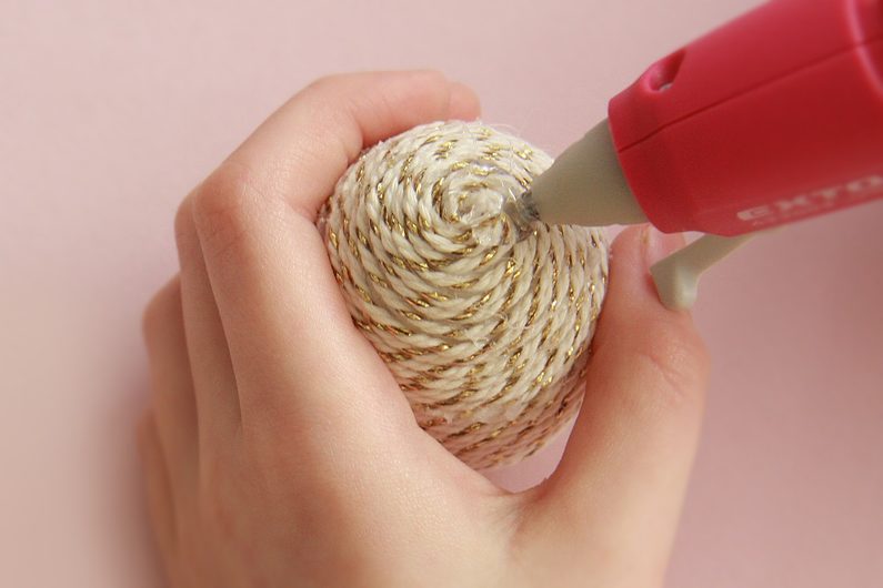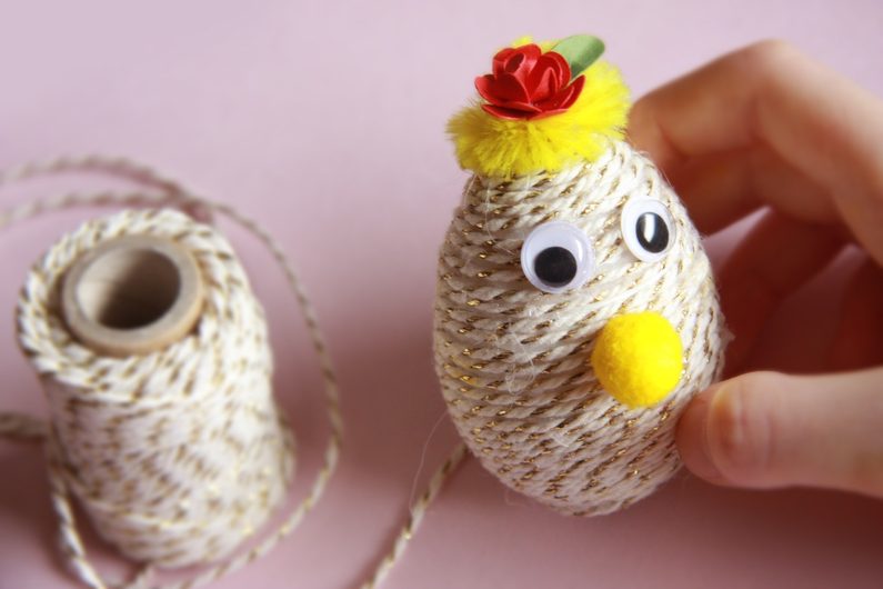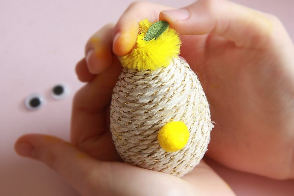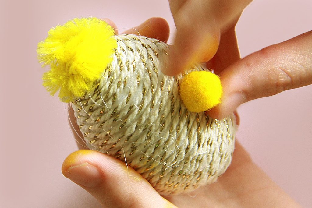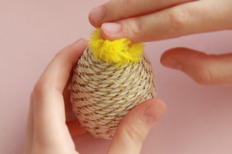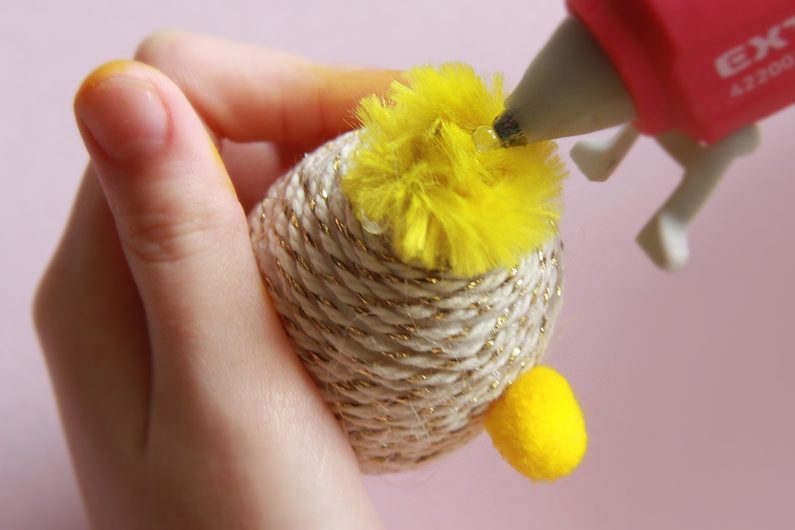 Zhruba doprostřed výšky vajíčka přilepíme dekorační bambulku.
