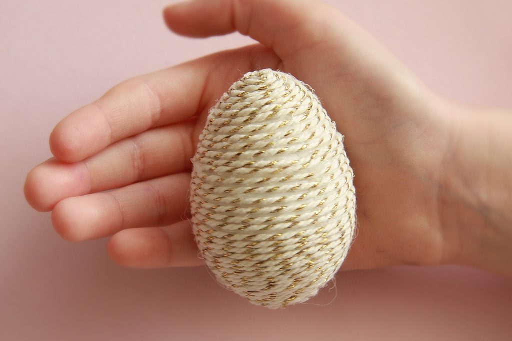 Omotané vajíčko, si nachystáme tak aby jeho širší část byla dole a užší část nahoře. Vezmeme žilnylkový drátek cca 7 cm, vytvarujeme ho do kruhu a přilepíme na špičku (horní část) vajíčka.