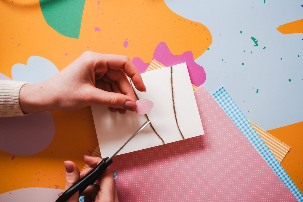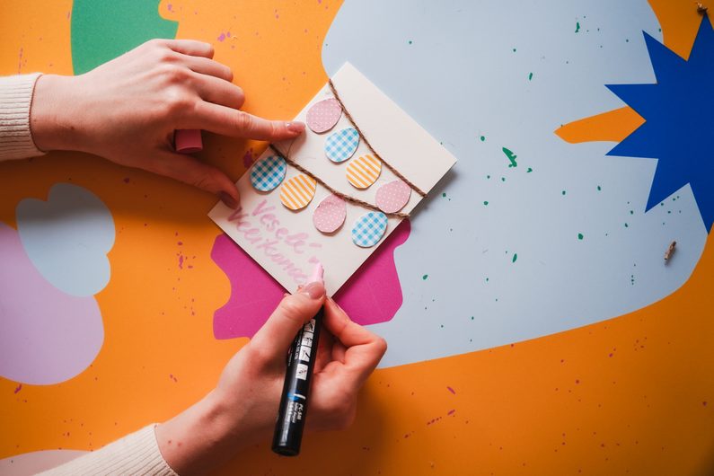 Z barevných papírů si vystřihneme různě barevná, stejně veliká velikonoční vajíčka a ta pomocí pistole nalepíme pod provázek.