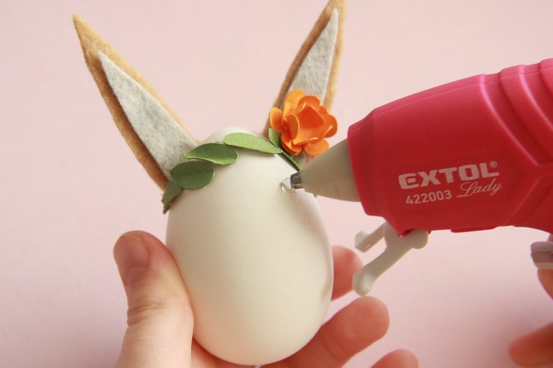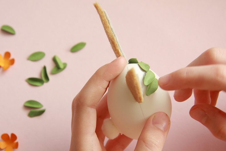 Lístečky přilepíme tavnou pistolí kolem vajíčka.