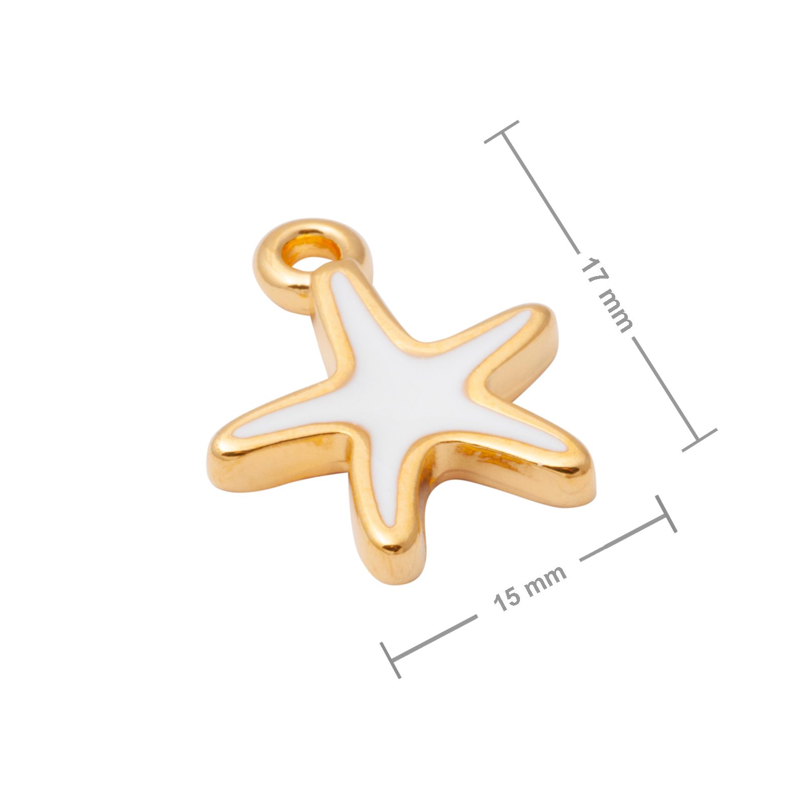 Manumi prívesok morská hviezda 17x15mm pozlátený je komponent so špeciálnou smaltovou úpravou a motívom mora, ktorý bude ideálny do vašich vrstvených náramkov a náhrdelníkov. Vďaka povrchovej úprave vzácnymi kovmi ho môžete skombinovať napríklad so striebornými alebo pozlátenými retiazkami, ale tiež so Shamballa šnúrou a ďalšími navliekacími materiálmi. Krásne vynikne tiež ako komponent v náušniciach.