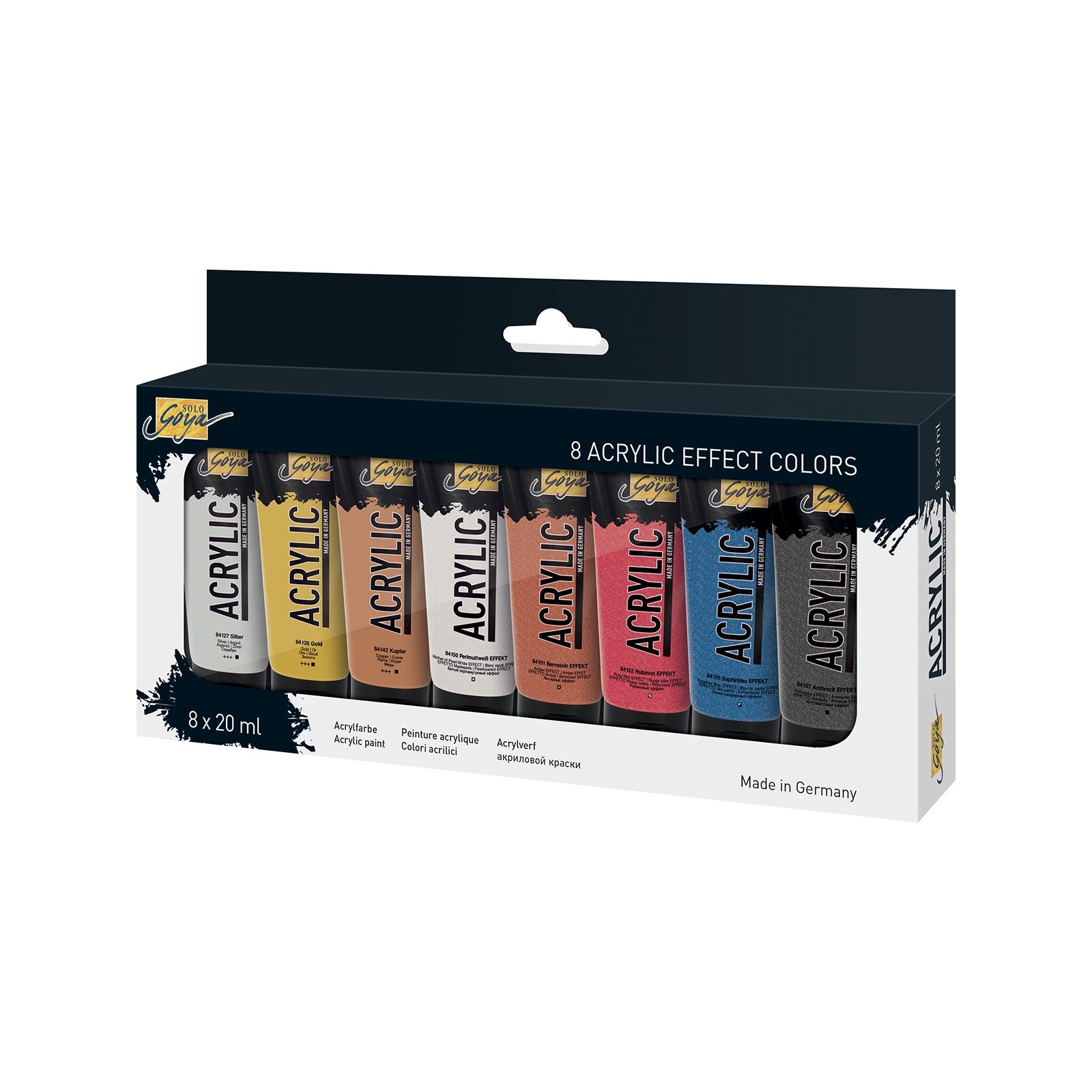 Sada akrylových metalických farieb Solo Goya 8 farieb 8x20ml spadajúca pod nemeckú značku KREUL je vysoko pigmentová sada 8 farieb obľúbených hlavne pri štúdiu a práci vo voľnom čase. Rýchloschnúca, mäkká konzistencia akrylových farieb je vhodná na vonkajšie aj vnútorné použitie. Sú vyrobené na vodnej báze s vysokou intenzitou farby, vyššou svietivosťou a dobrou krycou schopnosťou. Možno ich použiť na rôzne povrchy, ako je drevo, kov, kameň, papier, kartón a plasty.