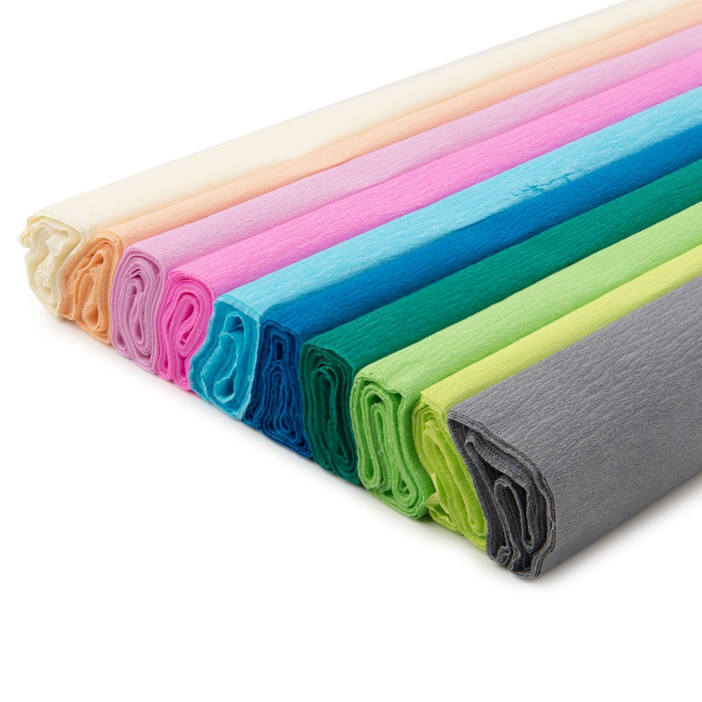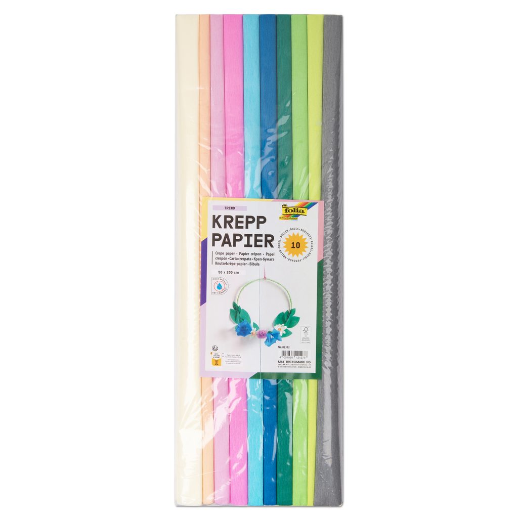 Sada krepových papierov Trend obsahuje 10 roliek krepového papiera v trendy farbách. Krepový papier sa používa na školské, výtvarné aj aranžérske práce. Dajú sa z neho vytvoriť jednoduché aj efektné dekorácie a ozdoby, ako sú napríklad papierové kvetiny alebo piñaty a girlandy na detské oslavy. Každá rolka má rozmer 50 x 200 cm.