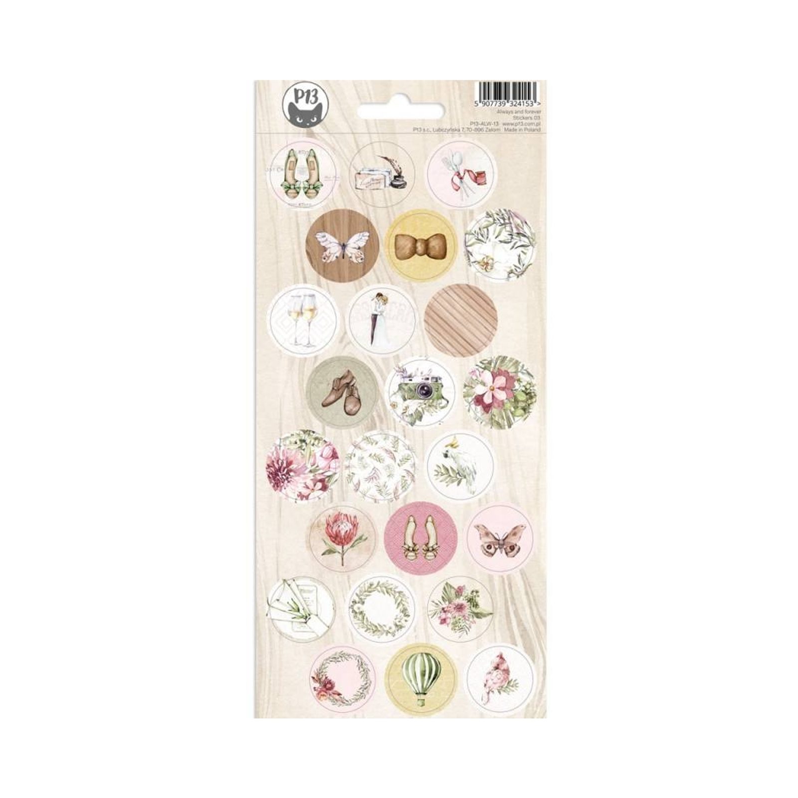 Samolepky so svadobnými motívmi „Always and forever“ využijete pri scrapbookingu, vytváraní (svadobných) albumov, balení (svadobných) darčekov aj ďalších kreatívnych aktivitách. Na archu nájdete 24 okrúhlych samolepiek s priemerom 24 mm. Samolepky sa krásne dopĺňajú so scrapbookovými papiermi s rovnako nazvaným motívom.
