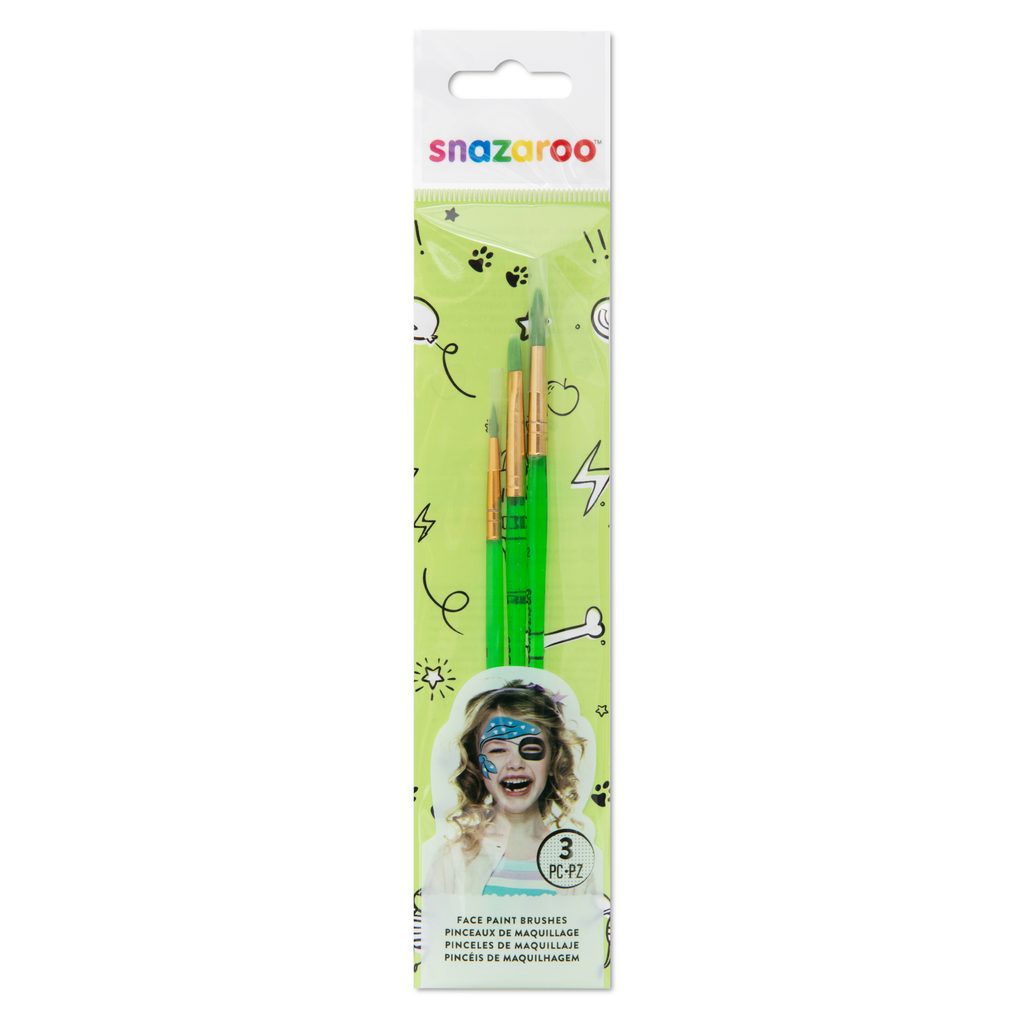 Snazaroo štetce na maľovanie na tvár sú nenahraditeľným pomocníkom na vytváranie originálnych masiek a mejkapu. Sada obsahuje dokopy 3 štetce (1 plochý, 1 špicatý väčší a 1 špicatý menší), pomocou ktorých dokážete vytvoriť celý rad efektov a liniek. Produkty a farby od Snazaroo sú obľúbené aj medzi profesionálmi.
