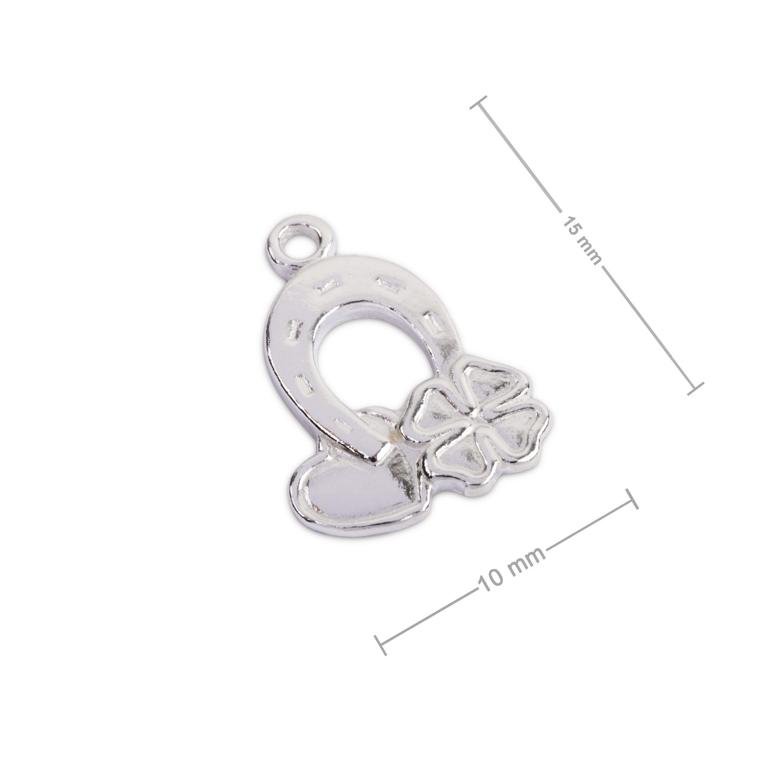 Stříbrný přívěsek koncovka "pro štěstí" ve tvaru podkovy se srdíčkem a s čtyřlítkem, o rozměru 10 x 15 mm, doporučujeme zavěsit na řetízek či náramek s jemným vzorem. Hodí se také na trendy šperky ze Shamballa šňůr. Přívěsek je vyrobený z kvalitního stříbra Ag925/1000, které vám zaručuje jeho dlouhou životnost a stálobarevnost.