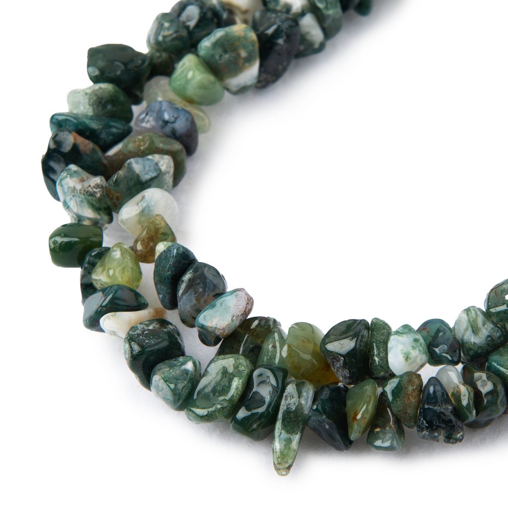 Zlomky z minerálu Achát mechový jsou navlečené na šňůře o délce 80 cm a můžete je využít k výrobě šperků nebo dekorací. Zlomky jsou oblíbené pro své nepravidelné tvary, které se krásně doplňují v kombinaci s individuální přírodní kresbou jednotlivých korálků. Minerály údajně vyzařují energie, které pozitivně působí na organismus. Pokud se chcete dozvědět více o jednotlivých minerálech, přečtěte si náš článek Vše, co jste kdy chtěli vědět o minerálech. Sepsali jsme pro vás také článek o špercích z minerálů podle znamení zvěrokruhu nebo jak si pomocí minerálů vyčistit čakry.